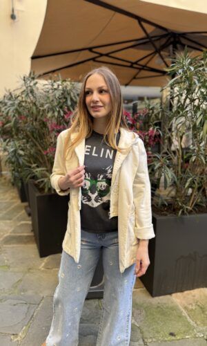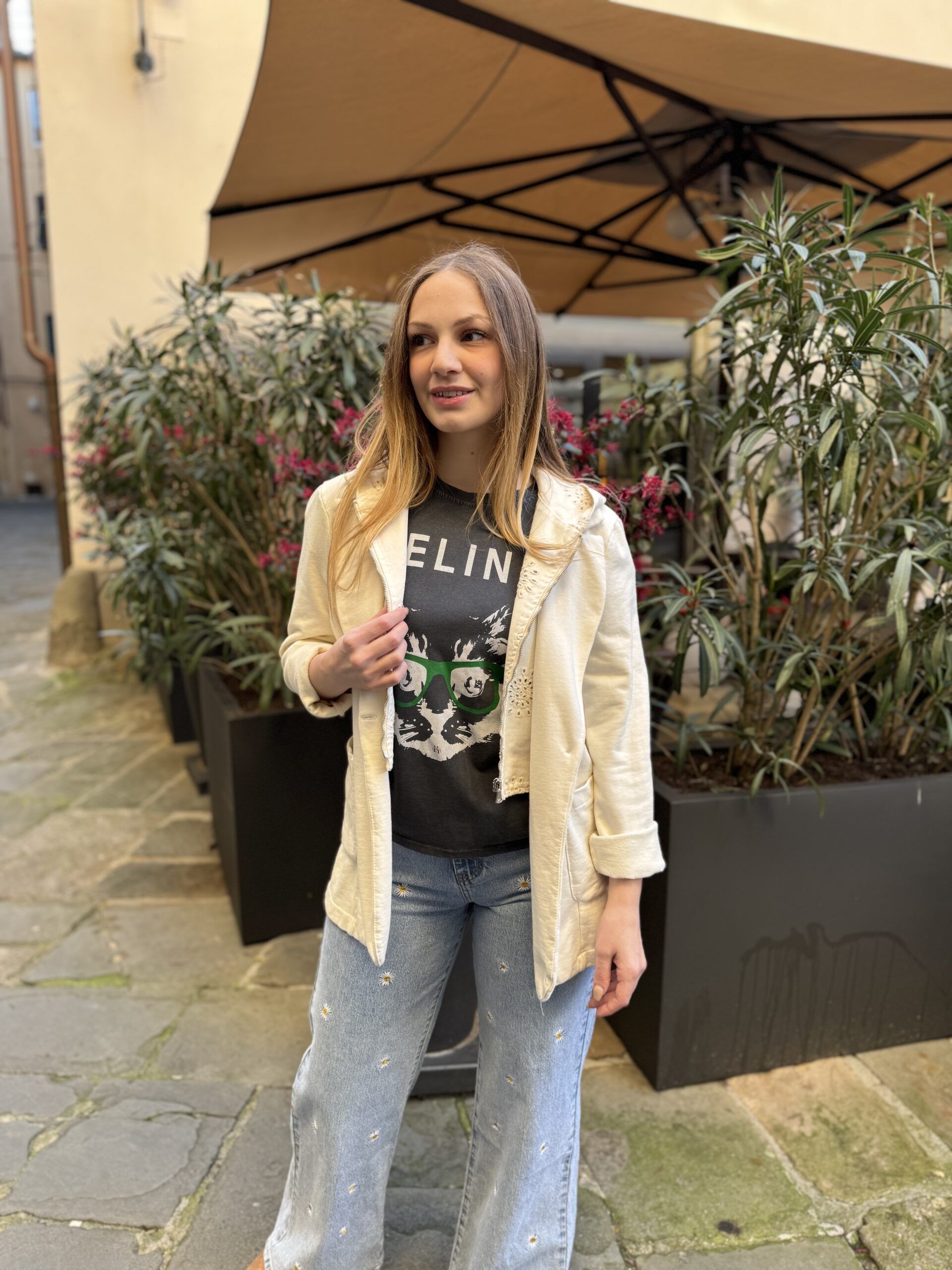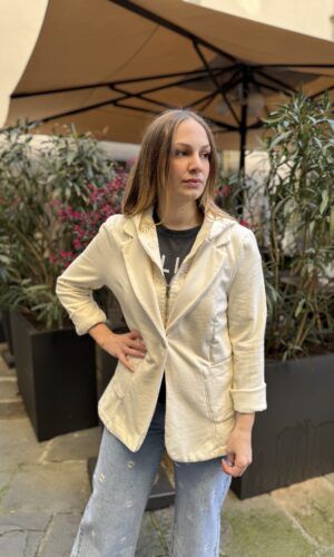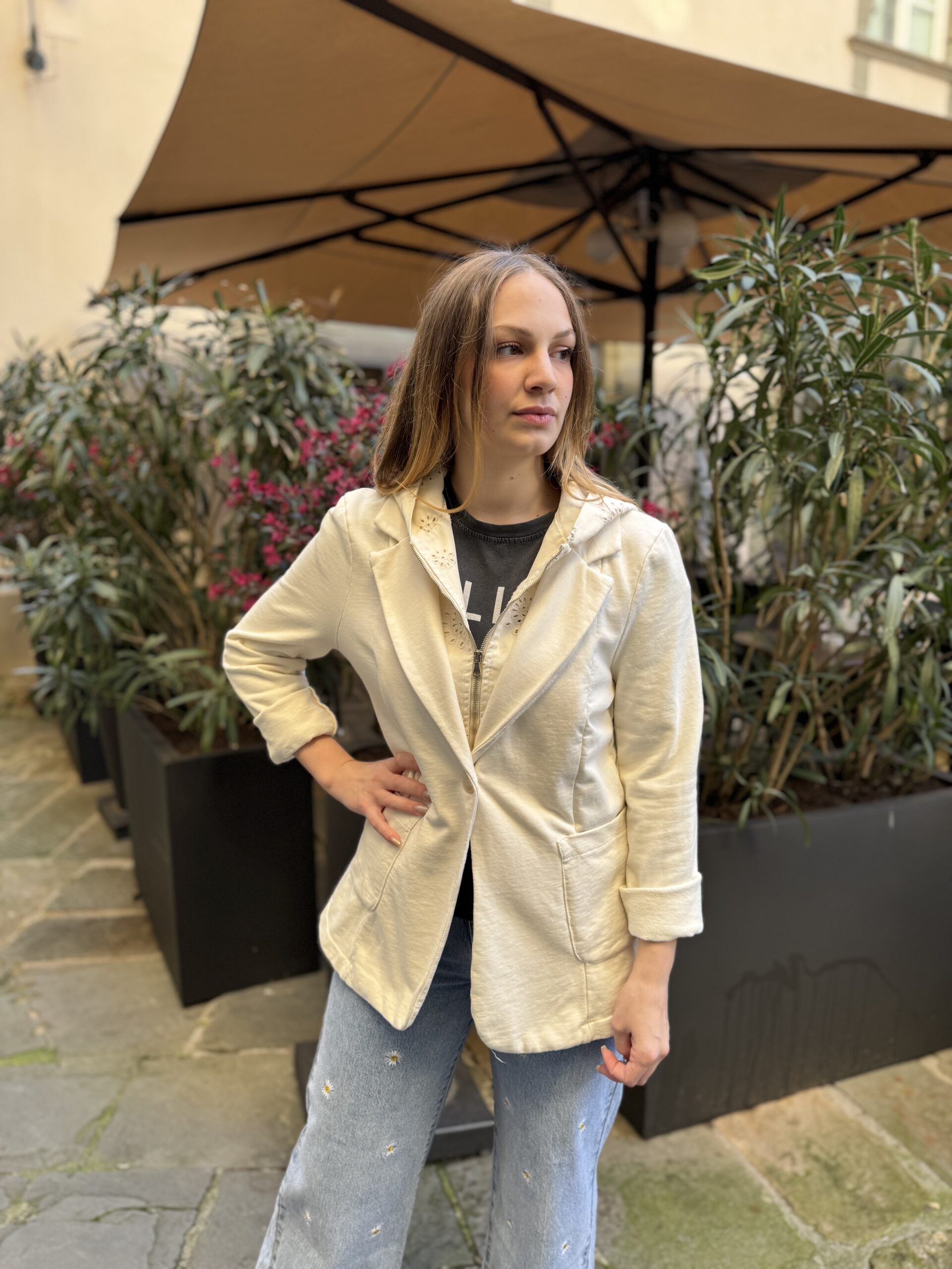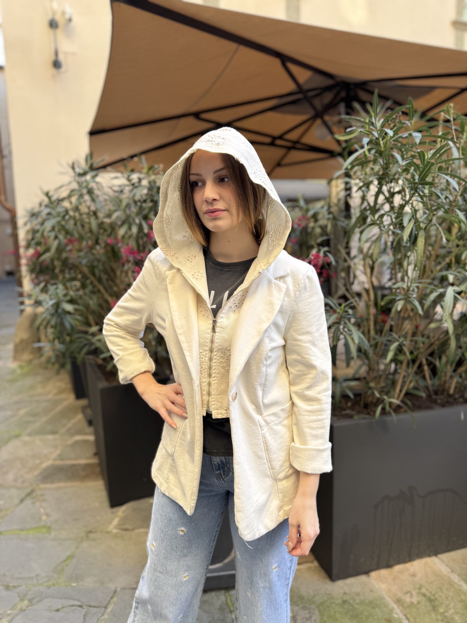 Blazer in felpa, con cappuccio in pizzo san gallo, bottone e zip , tasche frontali